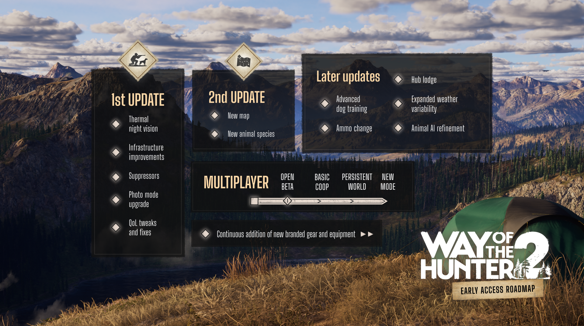 Way of the Hunter 2 agora tem um plano oficial de atualizações, chamado de "roadmap". Esse plano mostra como os desenvolvedores pretendem melhorar o jogo com novas funcionalidades, sistemas de jogo, equipamentos, locais e animais.